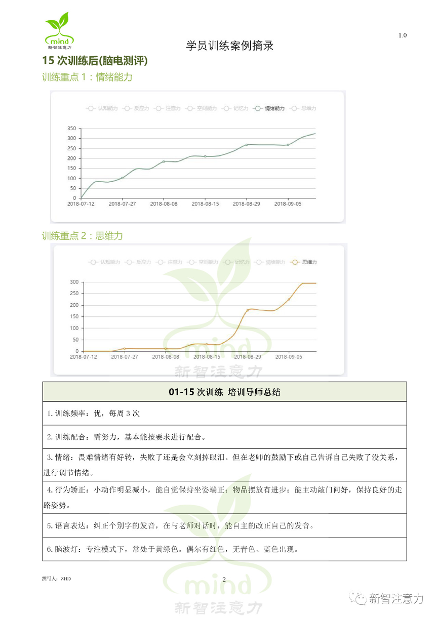2. 每经过一段时间训练之后,新智注意力提供阶段训练报告,家长能看到学员每一个训练项目的详细记录。从脑波曲线看,孩子有明显的提升;小学班主任向家长反馈,孩子在一个月的时间内改善明显,家长因此主动增加训练次数(从每周2次增加到3次)。