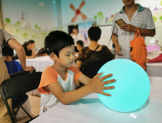 新智注意力新开发的脑电蜘蛛机器人首次亮相科技馆,引起了孩子们的极大兴趣。孩子们头戴Cuband脑波仪,以大脑注意集中度控制脑电蜘蛛。