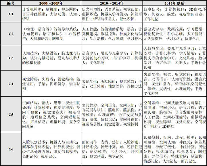 关于人脑的研究是六大学习科学中心研究的重要主题。如表1所示,从2000年初,有关脑的关键词就开始出现,且相关研究发展迅猛。近年来,关于脑的研究问题更加聚焦,研究内容更加宽泛,并和很多现实的教育问题紧密联结起来了。关于脑的研究关键词主要有:脑机制、大脑功能、脑结构、脑电信号、脑波、大脑和语言、人工智能、大脑潜能、脑成像与行为、人脑与学习、脑损伤、脑健康、特殊大脑等。