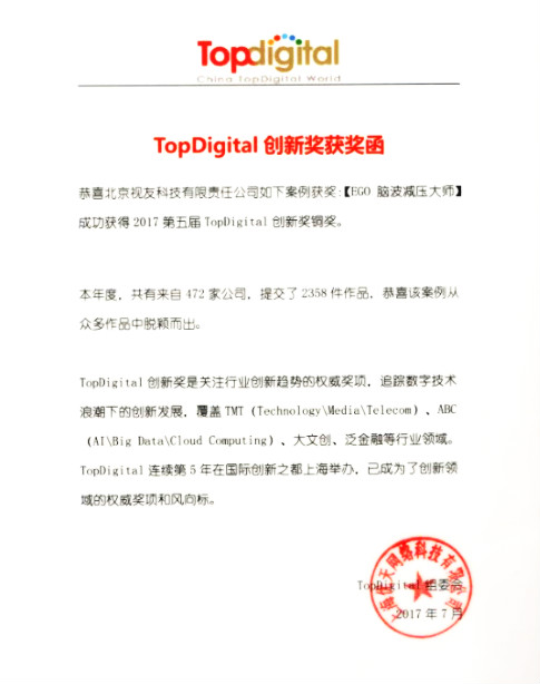7月5日,2017第五届Top Digital 创新盛典颁奖典礼在上海隆重举行,视友科技Ego脑波减压大师(又称Ego冥想脑波舱)成功斩获 Top Digital 创新大奖铜奖,与今日头条、360、芒果TV、爱奇艺、Video++、搜狗、腾讯网络媒体、京东、LG、旺旺集团、环球车享-EVCARD、蔚来资本等获奖公司一起共话未来。