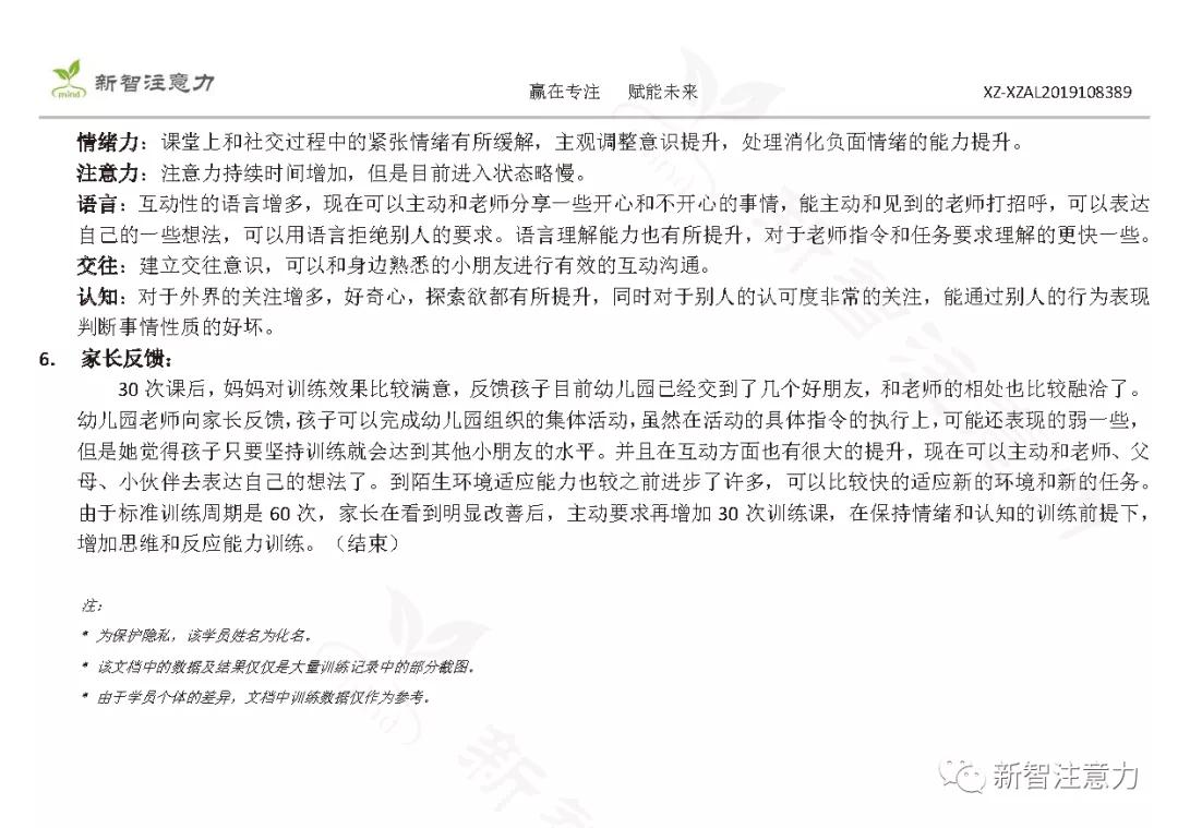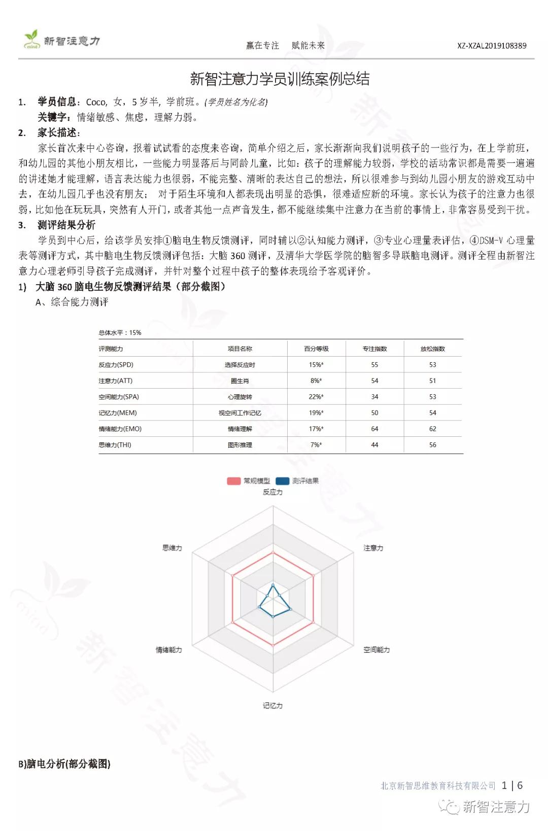 在新智注意力,我们通过脑电生物反馈训练、认知能力迁移强化训练、家庭养育方案三个维度来改善学员的弱项能力。借助安全便携的生物反馈设备,采集学员大脑认知能力相关的生理参数(EEG),与训练项目结合,实施客观、精准地测评,因人而异地1V1训练。在整个训练周期内,心理特教老师也会根据每位学员的特点,借助心理学工具方法等,实施因“脑”施训,快速解决家长们关心的问题;当然,学员的能力的提升与每位家长的坚持与配合是分不开的。下面我们在近期刚毕业的学员档案中摘取一例,供家长们了解新智注意的训练方式。