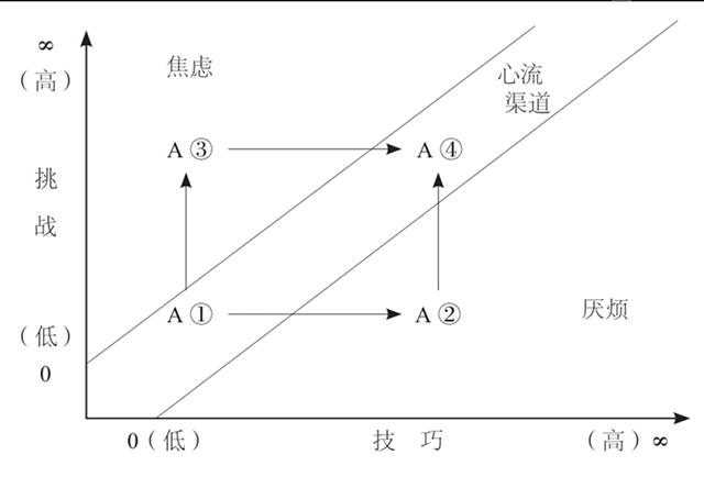 厌倦和焦虑都属于消极的体验,艾利斯有充分的动机想回到心流。他该怎么办?从图中我们可以看出,如果他在厌倦(A②)的位置,要回到心流只有一个选择:加强挑战(他当然还有一个选择:放弃打网球,那么图形中的A干脆就消失了)。他确立一个跟技巧难度相当的新目标——例如击败一个技巧比他高明一点儿的对手——就能进入心流(A④)。如果艾利斯感到的是焦虑(A③),回到心流就需要加强技巧。理论上,他也可以降低挑战的难度,回到一开始时的心流(A①),但实际上,一个人知道存在挑战以后,是很难全然置之不顾的。图形中的A①与A④都代表艾利斯正处于心流状态。虽然两者都能带来乐趣,但A④的情况远比A①复杂,它不但是更大的挑战,而且对打球者的技巧要求也更严格。但是就A④的复杂程度与充满乐趣而言,它并不稳定。艾利斯想继续打网球,不是因为发现新层次的发展有限而厌烦,就是因为自己能力不高而产生焦虑与挫折感。这么一来,为了再次寻回乐趣,他就势必设法回到心流渠道,而现在的复杂程度甚至比A④还高了。