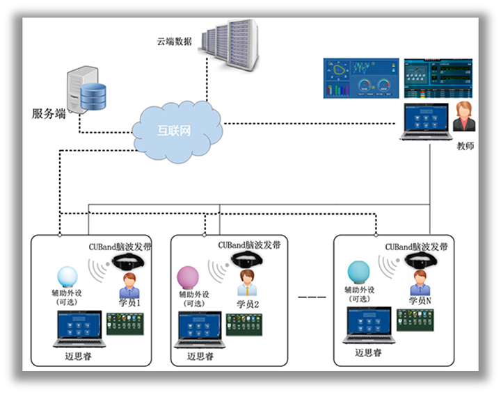 (1) 迈思睿团体版采用CUBand脑波仪进行脑电数据实时采集,全面整合分析实时脑电数据与行为训练数据;教师端可组织进行团体认知测评、团体量表测评、团体脑电参数监测等多项团队测评任务,以及团体认知能力训练、开放式情景训练、开放式引导训练、团队脑电对抗训练、团队脑电协同训练等多项团队训练任务;学员同时使用思语脑波灯进行同步脑电反馈训练